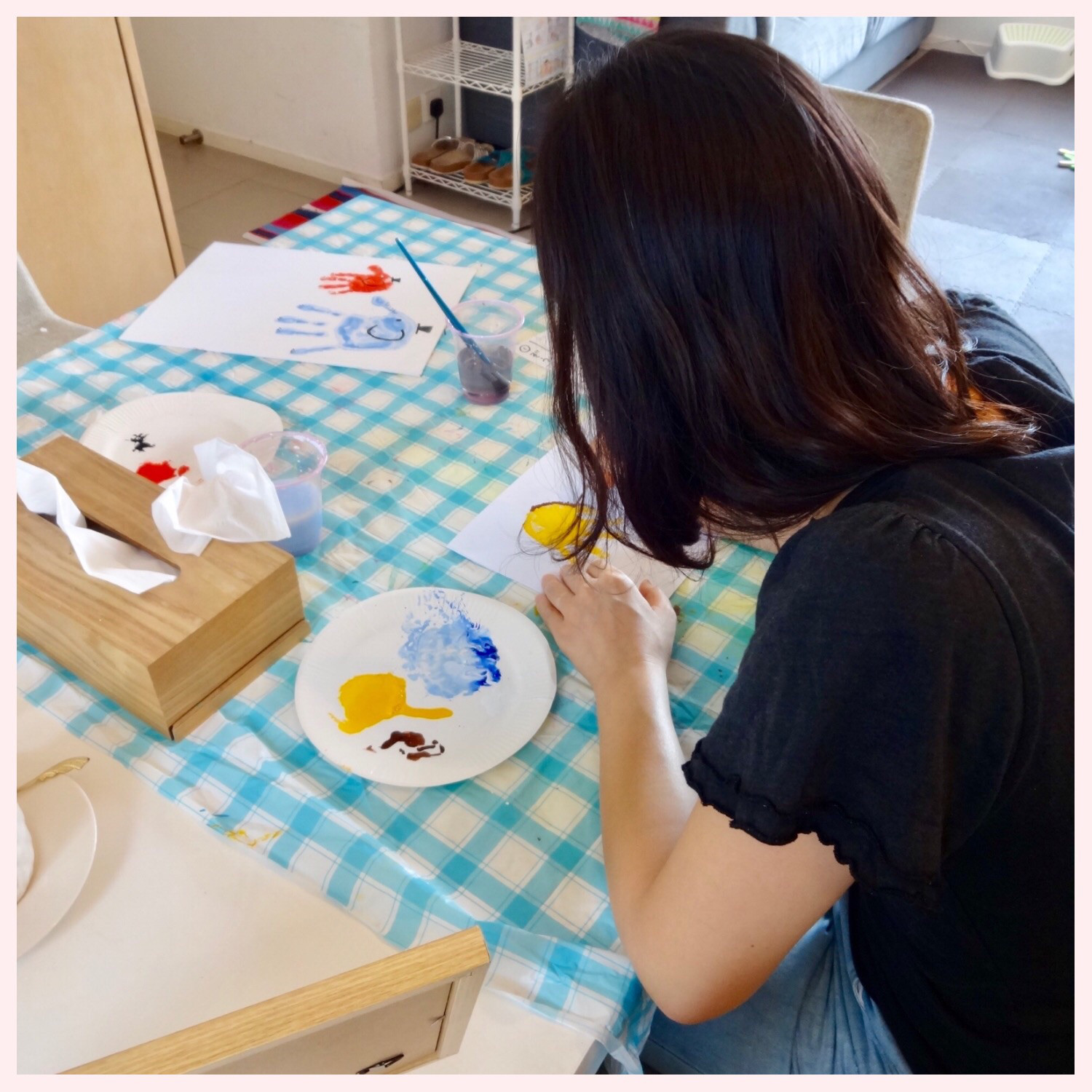 ➁イメージが決まったらお子さんの手or足に絵の具を塗ってペッタン!